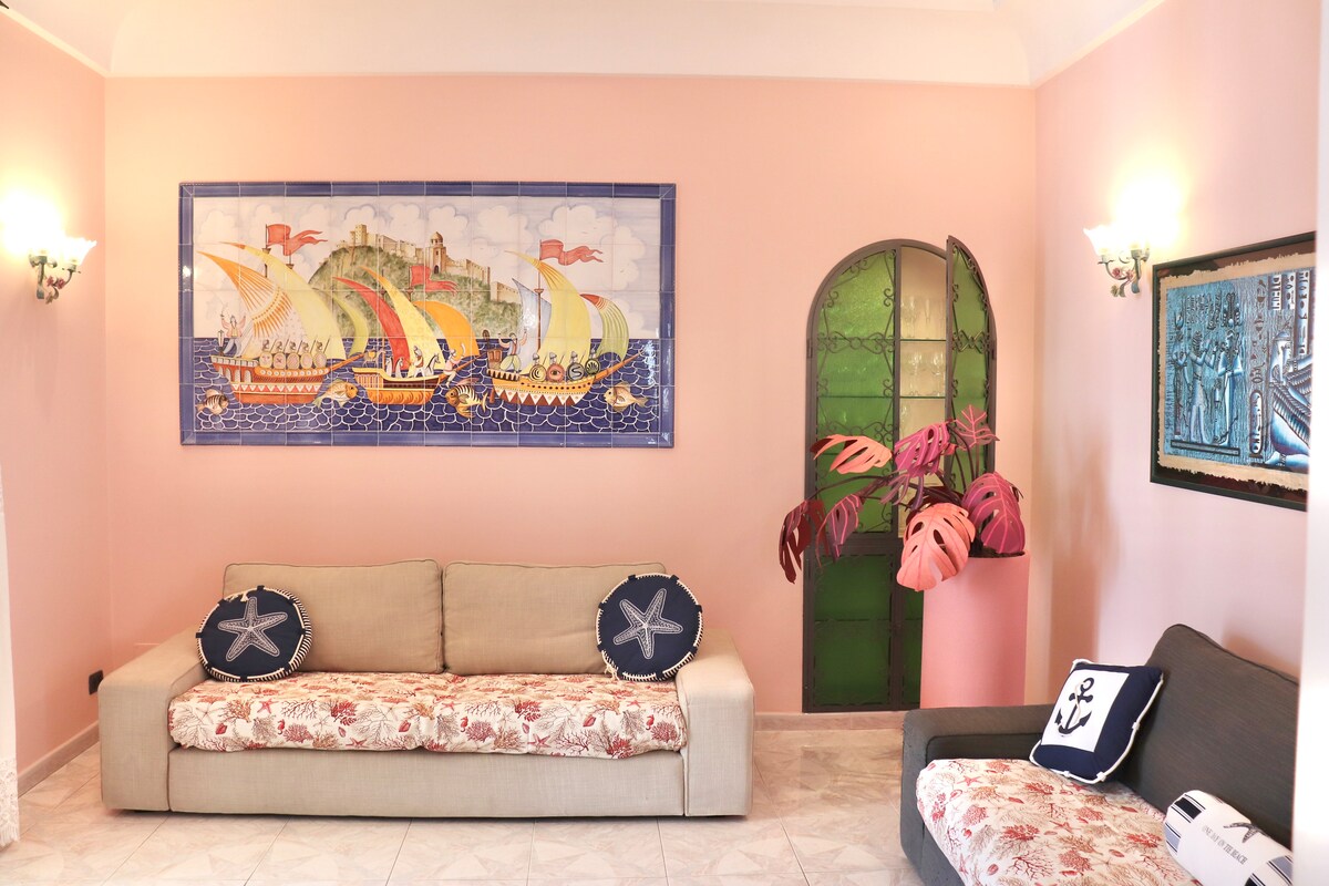 Apartament confortabil, recent renovat, într-o zonă cu trafic controlat, la câteva minute de mers pe jos de mare. Are o vedere minunată la Castelul Aragonese, golful Saint Anna și Capri. Apartamentul are două dormitoare, două băi, o zonă de bucătărie/living și o spălătorie. Are, de asemenea, un balcon spațios care înconjoară casa și unde poți lua micul dejun și să faci plajă. Are toate modurile contra: Wi-Fi, TV, aer condiționat, frigider și cuptor, spălare