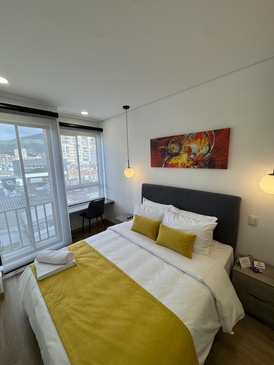 Bucură-te de un loft premium în inima orașului Chicó Un spațiu modern de 27 m², cu balcon privat, pat de lux, cearșafuri foarte moi, perdele motorizate, oglindă Bluetooth și lumini LED de ultimă generație. Ideal pentru șederi de lungă durată: are un birou ergonomic, Wi-Fi 5G și Smart TV cu Netflix, Disney+ și Prime Video. Include propria mașină de spălat și opțiune de curățenie săptămânală cu schimbarea lenjeriei de pat. Experimentează Bogotá cu stil și confort.