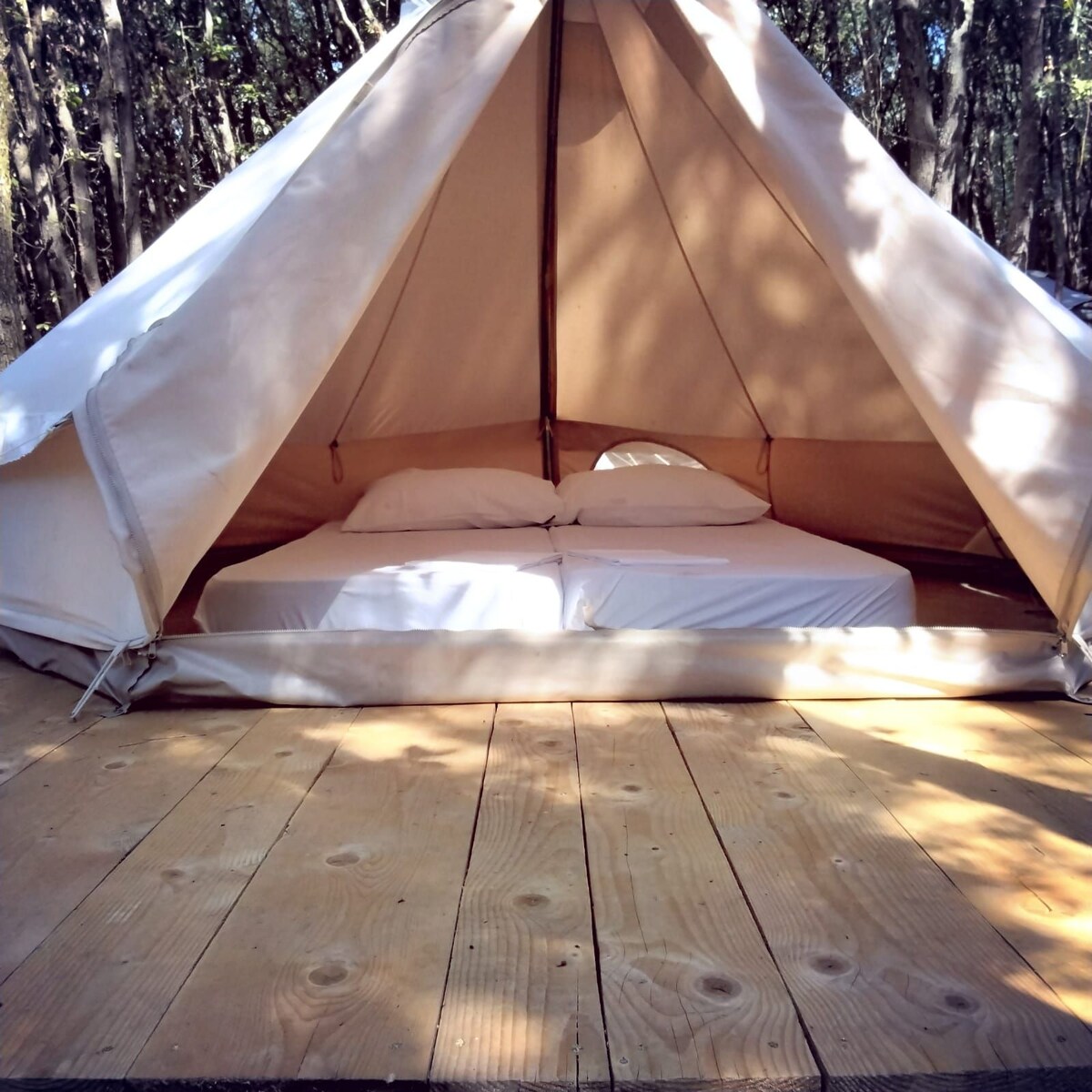 A dash of luxury in a deep shade of the oak forrest. The tent is for 2 persons and has 2 hotel materaces with complete linning, pillows and blankets. The camp has a shower and a toailet, gas cooking stowe and gas barbecue (for all guests to share). The camp is accessable with the car and the parking is just alongside the camp. No power, wifi or water in the camp. Strictly forbidden to light a fire. For true nature lovers, intact nature, birds, crickets...