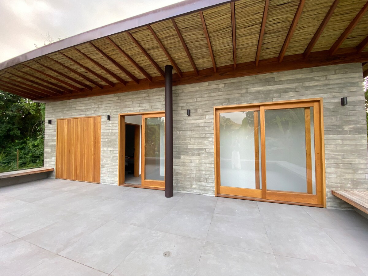 Design de Carlos Lemos, casa noastră este la parter, spațioasă și super luminoasă. Situat pe un teren cu vedere privilegiată la mare și munți. Este înconjurat de pădurea atlantică, cu puțini vecini, la aproximativ 500 de metri de plajă. Casa este destul de echipată cu o bucătărie completă și spălătorie și are internet rapid (100Mb) cu Wi-Fi în fiecare cameră. Livingul are șemineu, iar balconul în aer liber este destul de larg, cu punte, hamace și grătar portabil.