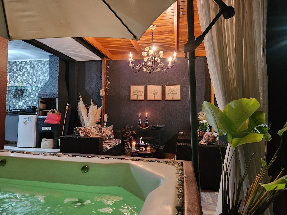 Divertisment cu întreaga familie în acest loc elegant, casa pentru 10 persoane compilează un decor boho praiana, care amintește de colonia portugheză cu o notă modernă. Are o piscină cu o cascadă privată, precum și posibilitatea de a utiliza piscina comună a pensiunii cu mic dejun. Are o zonă privată împrejmuită, inclusiv parcare și o zonă privată de grătar. Există 50 m de mare, în cea mai selectivă stațiune Itapoá, cu piață, farmacie, brutărie, magazin de fructe, friptură și snack baruri din apropiere