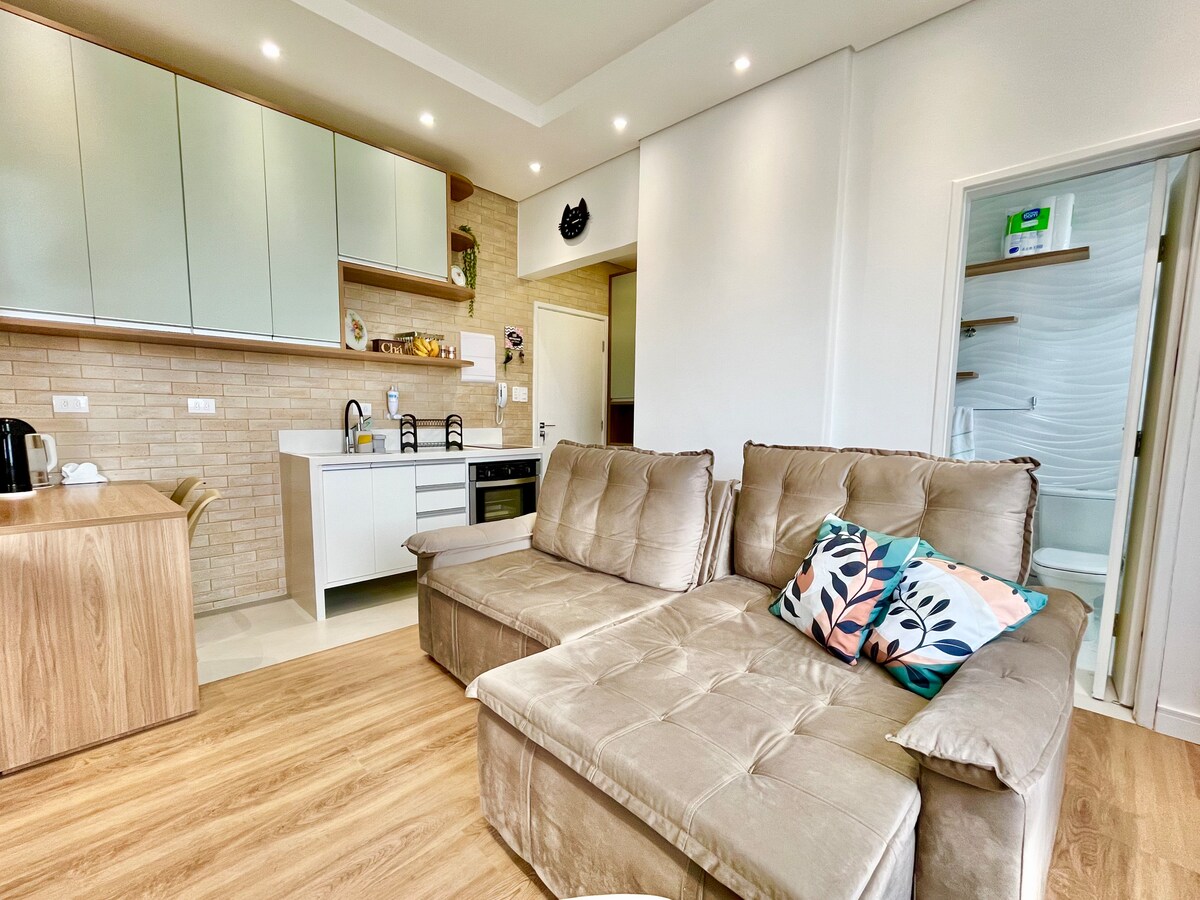 Acest apartament de 55 m² este ideal pentru cupluri și directori în călătorii de afaceri. Are tot ce-ți dorești de la un apartament: caracter practic și tehnologie. Pentru cei care vin să petreacă Revelionul în Santos, vă puteți bucura de festivități fără a părăsi clădirea. Din zona piscinei, te poți bucura de vederea la mare, de artificii și de atmosfera festivă a orașului, fără a fi nevoie să te ocupi de trafic, de mulțimi sau de un drum obositor după artificii.