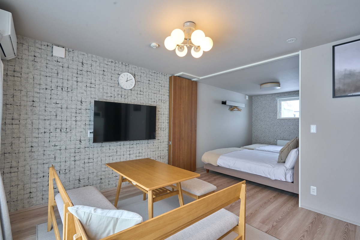Newly built 2-bedroom apartment in central Kutchan, a 7-minute walk from JR Kutchan Station. HANAZONO Resort is a 10-minute drive and Grand Hirafu about 13 minutes away. Ideal for 3–4 friends, couples, or families visiting Niseko. The apartment features a spacious living room, equipped kitchen, ski storage, and fast Wi-Fi for relaxing after a day on the slopes. Restaurants, cafés, and a large supermarket are within walking distance. Enjoy local food and experience Niseko like a local.