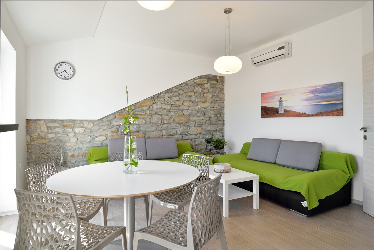 Perfect pentru cupluri, aventurieri solo și familii mici. Un loc foarte liniștit, potrivit pentru lucrul cu internetul rapid pentru nomazi. Primești o priveliște încântătoare a văii de la fereastră, o zonă confortabilă de luat masa și de locuit cu chicineta, tot confortul de a avea cafeaua de dimineață sau o masă frumoasă cu un pahar de vin în intimitatea ta. Vederi uimitoare la coasta slovenă, livezi de măslini și podgorii în drum spre casă. La 2 km de ocean, plimbări frumoase și ciclism în apropiere. Taxa turistică de 2E p/buc.