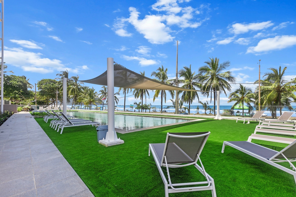 Cea mai bună poziție în inima orașului Jaco. Bucură-te de vedere la ocean din minunatul tău pat matrimonial într-un studio construit în 2024, pe malul oceanului, pe plajă, la o stradă distanță de fâșia principală Jaco. Mergi pe jos peste tot! Acest studio romantic privat complet, la etajul 8 are propria ușă de intrare, propriul balcon intim cu vedere la ocean, munți și oraș. În siguranță închisă, 2 piscine, sală de gimnastică, zonă de lucru, zonă de grătar și o terasă incredibilă la ultimul etaj cu vedere la 360 de grade. Pura vida!