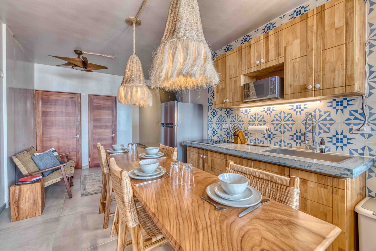 Playa Hermosa Surf. Apusuri de soare uimitoare! Bucură-te de ședere în acest penthouse de lux cu vedere la ocean, cu 1 dormitor matrimonial cu vedere la ocean, cu 1 pat matrimonial, dressing și baie. 1 dormitor cu pat matrimonial și baie, living/zonă de luat masa mare cu tavane înalte (1 canapea extensibilă suplimentară), bucătărie complet utilată, balcon mare cu vedere extinsă la Oceanul Pacific, grădină și vedere la munte. Ideal pentru un grup de prieteni sau familie de până la 5 persoane și pentru cupluri care doresc să vină și să se bucure de acest paradis.