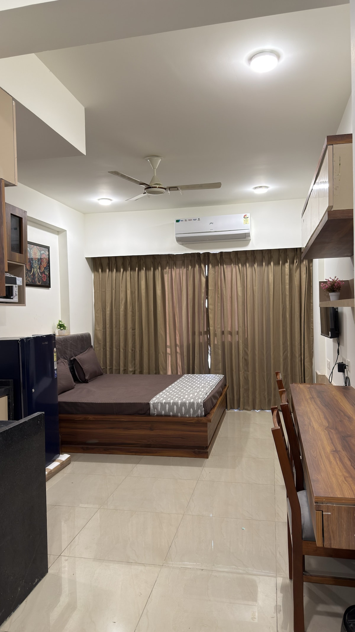 Modern luxury studio ideal for couples and business travelers. Enjoy a cozy bed, elegant interiors, and soft ambient lighting for a relaxing stay. Stay productive with high-speed WiFi and a comfortable workspace. The fully equipped kitchenette adds convenience, while free parking and self check-in ensure a hassle-free experience. Clean, private, and thoughtfully designed for comfort, work, and relaxation—your perfect home away from home.