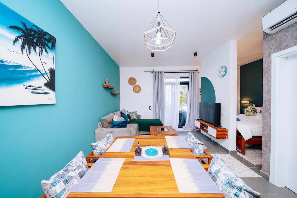 Bine ai venit la Paje Beach! Acest apartament cu grădină privată este locul tău pentru un sejur liniștit și relaxant, la doar câțiva pași de plajă, restaurante și magazine. Acest apartament frumos din complexul „The Soul” poate găzdui 2 adulți, plus un copil de până la 3 ani într-un pătuț de călătorie (disponibil la cerere). Apartamentul este complet echipat cu aer condiționat, congelator și TV inteligent și decorat cu gust. O piscină în lagună cu secțiune de mică adâncime pentru copii se află chiar în fața apartamentului.