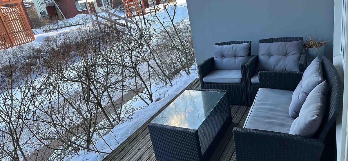 Apartament frumos cu terasă, cu saună, într-o zonă liniștită, la aproximativ 5 km de centrul orașului. În curtea 1 parcare auto și stație de autobuz din apropiere. Există o vedere la plaja publică de nisip a orașului din curtea din spate. Aproximativ 100 de pași prin pădure, de-a lungul drumului, la 0,5 km. O bicicletă poate fi disponibilă pe durata vizitei. Sper că oaspeții respectă Regulile casei și trăiesc cu respect pentru locuința mea. Una dintre camerele din triunghi este încuiată și nu este disponibilă pentru oaspeți.