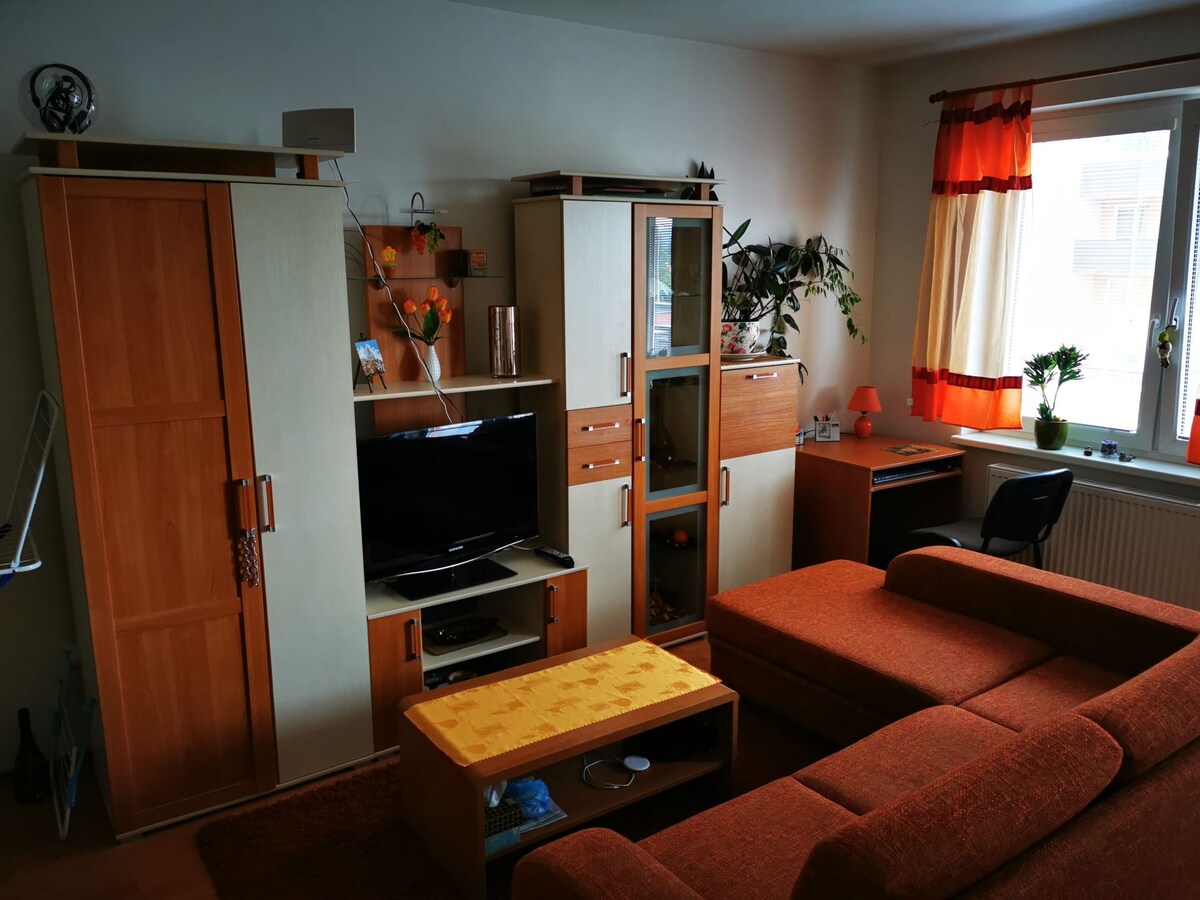 Apartament care are suflet. Apartamentul meu (38 m2)este situat la mai puțin de 15 minute de centrul orașului Bratislava cu autobuzul nr. 93. Stația de autobuz este situată direct în fața blocului de apartamente. Stația de tren nr. 3 spre centrul orașului, la doar 5 minute de mers pe jos de casă. Acest apartament este în stil retro. Este o atmosferă modestă, dar confortabilă,curată și minunată. Am WI-FI, TV (nu numai antenă TV prin cablu). Poți găti într-o bucătărie. De asemenea, am un aragaz electric, fierbător electric, mașină de spălat rufe, flux de suc, frigider.