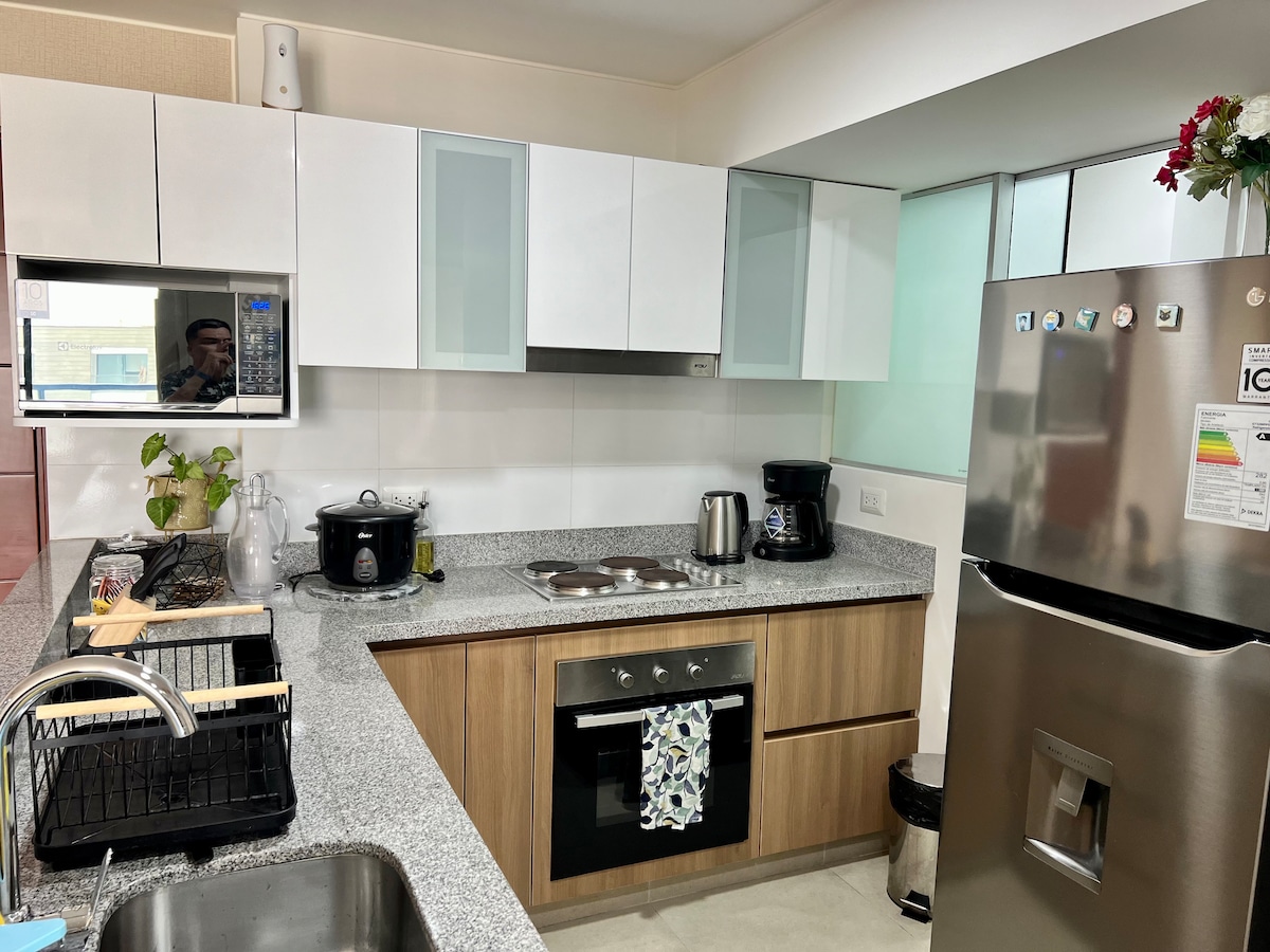.Studio ubicado en 5to. piso con ascensor y guardianía 24/7 entrada independiente, vista interior (no tiene vista al mar) . .Se entrega llaves. .Cuenta con Internet .Baño, con ducha, agua caliente. .Kitchenette equipado con cocina eléctrica (inducción), Frigobar, microondas, arrocera, hervidor, utensilios y menaje para 2 personas .Se entrega con ropa de cama y toallas . . Este espacio no esta destinado para realizar reuniones, citas o encuentros. VER REGLAS DE LA CASA.