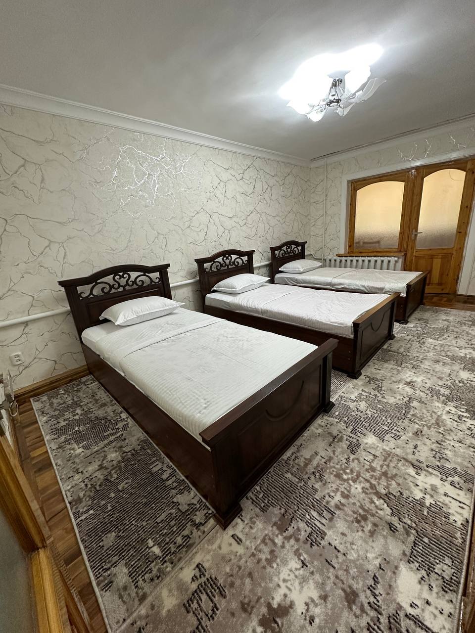 Locuința este situată central. În apropiere există magazine, un spital, restaurante cu bucătărie națională! Aici se fac cele mai bune pilaf și samsa! Există 4 camere în casă - bucătărie, hol, dormitor, toaletă/duș separat. Poate găzdui 2 persoane. 1 pat dublu, 1 canapea extensibilă, 1 pat single. Toate dotările sunt disponibile, inclusiv mașină de spălat rufe, aer condiționat, TV cu ecran plat mare, acces la căutare de filme, YouTube etc. Ne putem întâlni personal la gară sau la aeroport!