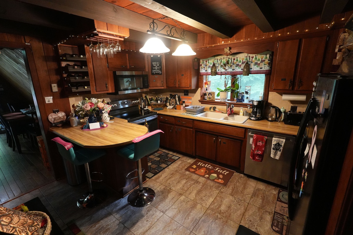 Retragere, escapadă izolată, dar în apropiere de oraș. Această cabană confortabilă este rustică, cu un fler șic, decor și actualizări recente. Amplasat privat pe 2 acri împăduriți și în apropierea orașului. 2 șeminee de piatră, cadă cu hidromasaj interioară, 2 1/2 BA, 3-4 BR și 7 persoane cadă cu hidromasaj în aer liber. WIFI excelent, bucătărie și luat masa. Picnic, grătar și groapă de foc. Frunziș de toamnă mare, lângă schi, lângă drumeții, lansare cu barca. Complet echipată, doar adu-te!! Dorind să găzduiască oaspeții - mască!!