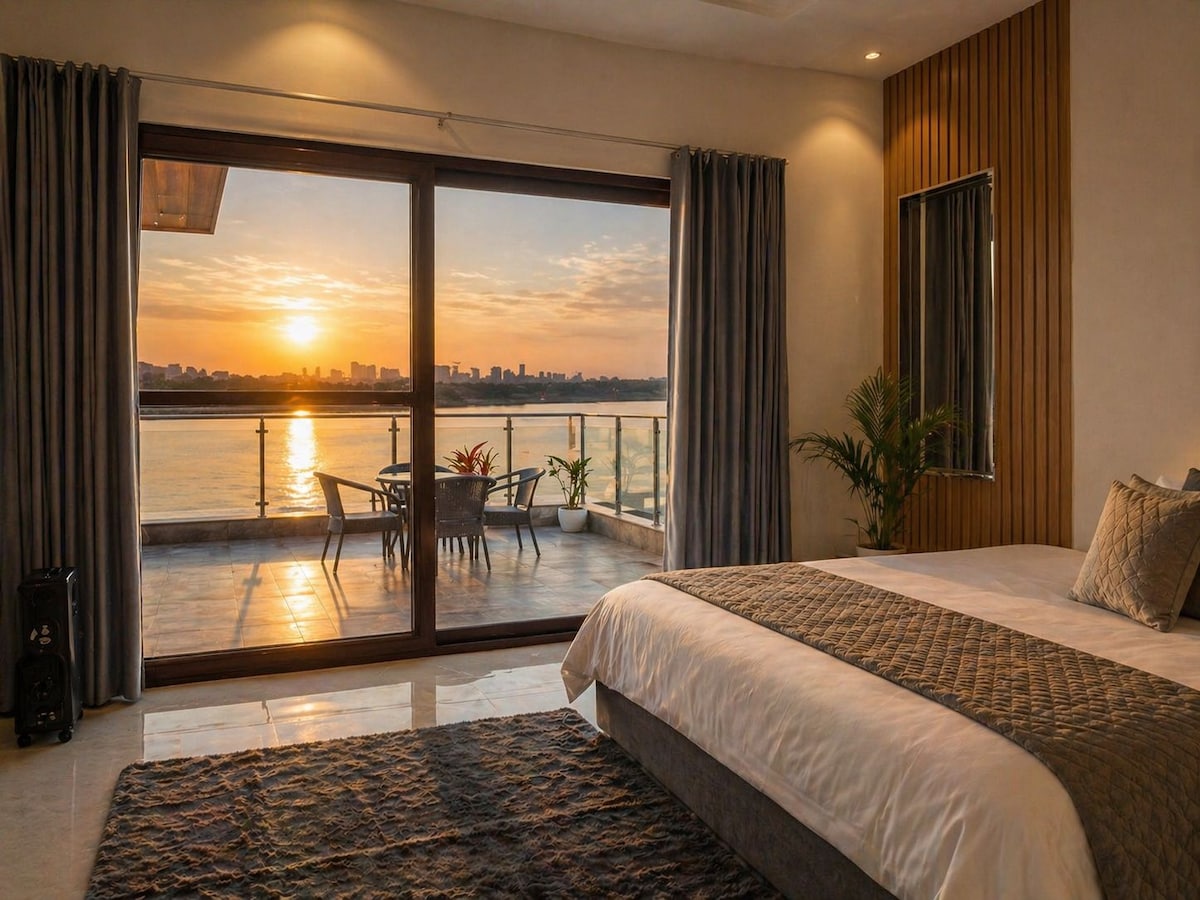 Step into a sanctuary where modern comfort meets the serene spirit of the Ganga. Nestled just steps away from the river, this stylish and calming retreat is designed for travelers who seek peace, rejuvenation, and a touch of luxury. Wake up to soft sunlight filtering through large windows, enjoy your morning chai on a private balcony with fresh river breezes, and unwind in thoughtfully curated interiors that bring together elegance, comfort, and nature.