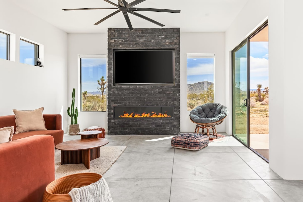 Scufundă-te în această casă luxoasă cu 3 dormitoare și 2 băi, recent construită, cu ferestre expansive care dezvăluie peisajele uluitoare, o piscină încălzită strălucitoare și un spa pentru scufundări înstelate și un spațiu de fitness dedicat. Relaxează-te sub cerul nesfârșit pe 2 hectare întinse în propria ta oază privată, perfectă pentru observarea stelelor și adunări pe terasă. Trezește-te la răsărituri uluitoare, explorează minunile din altă lume ale lui Joshua Tree, apoi întoarce-te pentru o baie de întinerire în paradisul tău deșert.