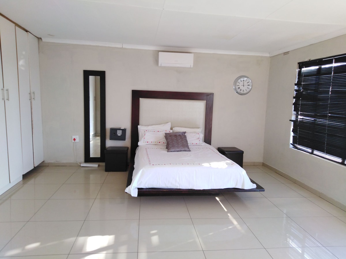 Bine ai venit la o escapadă de lux în inima tufișului! Cabana noastră uimitoare oferă patru camere frumos decorate, fiecare cu zone de relaxare, mese de toaletă, dușuri interioare și exterioare, căzi de baie, chiuvete duble și aer condiționat, plus că avem acoperire. Bucură-te de o bucătărie complet utilată și de un spațiu liniștit în aer liber cu vedere la gaura de udare a animalelor, dotată cu piscină, vatră și zonă braai. Liniște la superlativ!