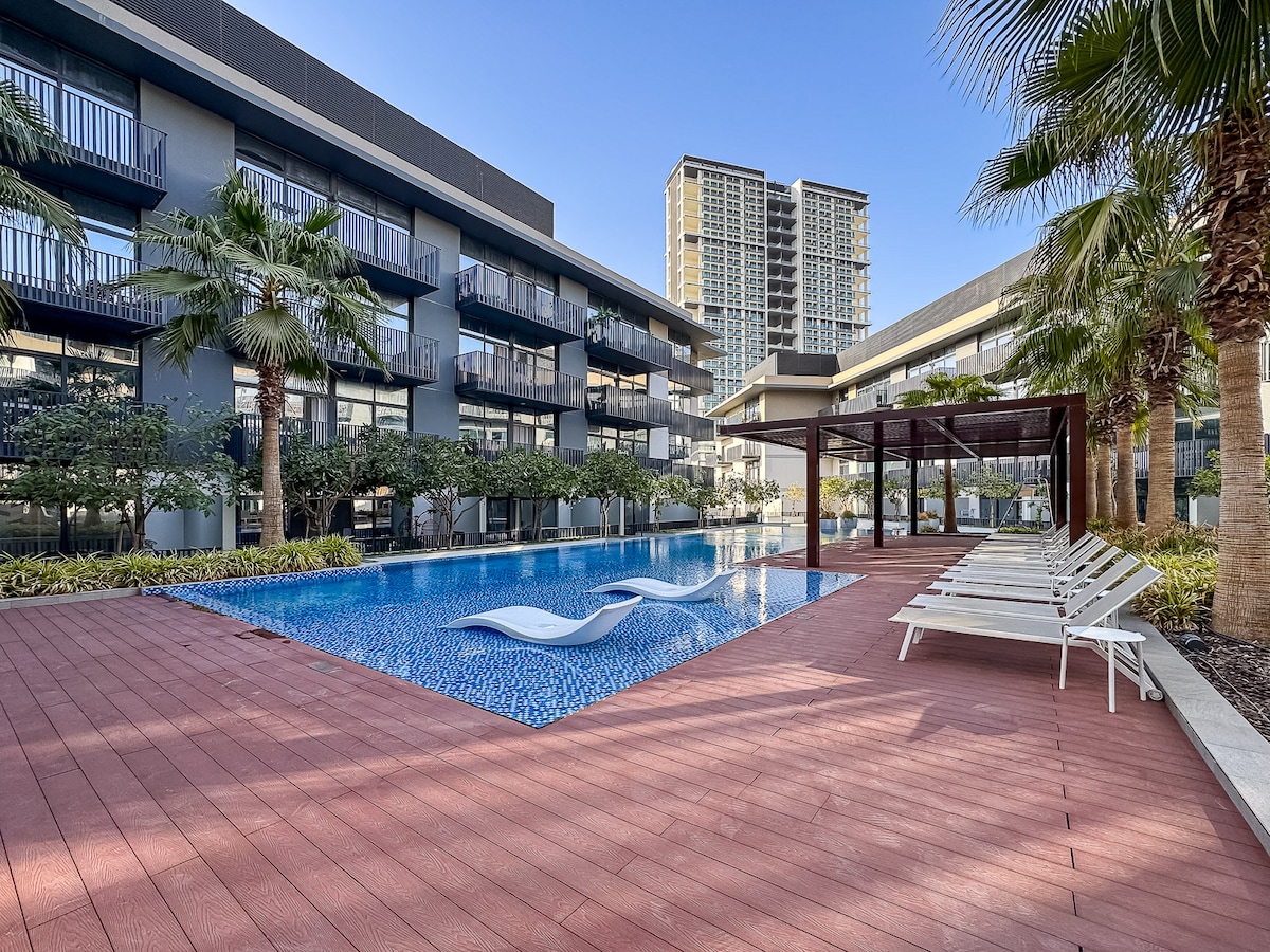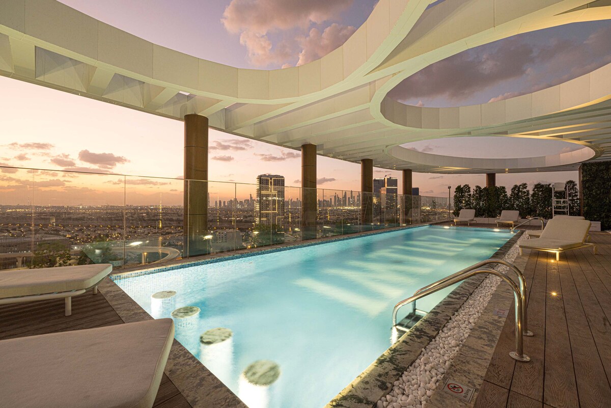 Luxe 1BR cu piscină, sală de gimnastică și PS5 în JVC