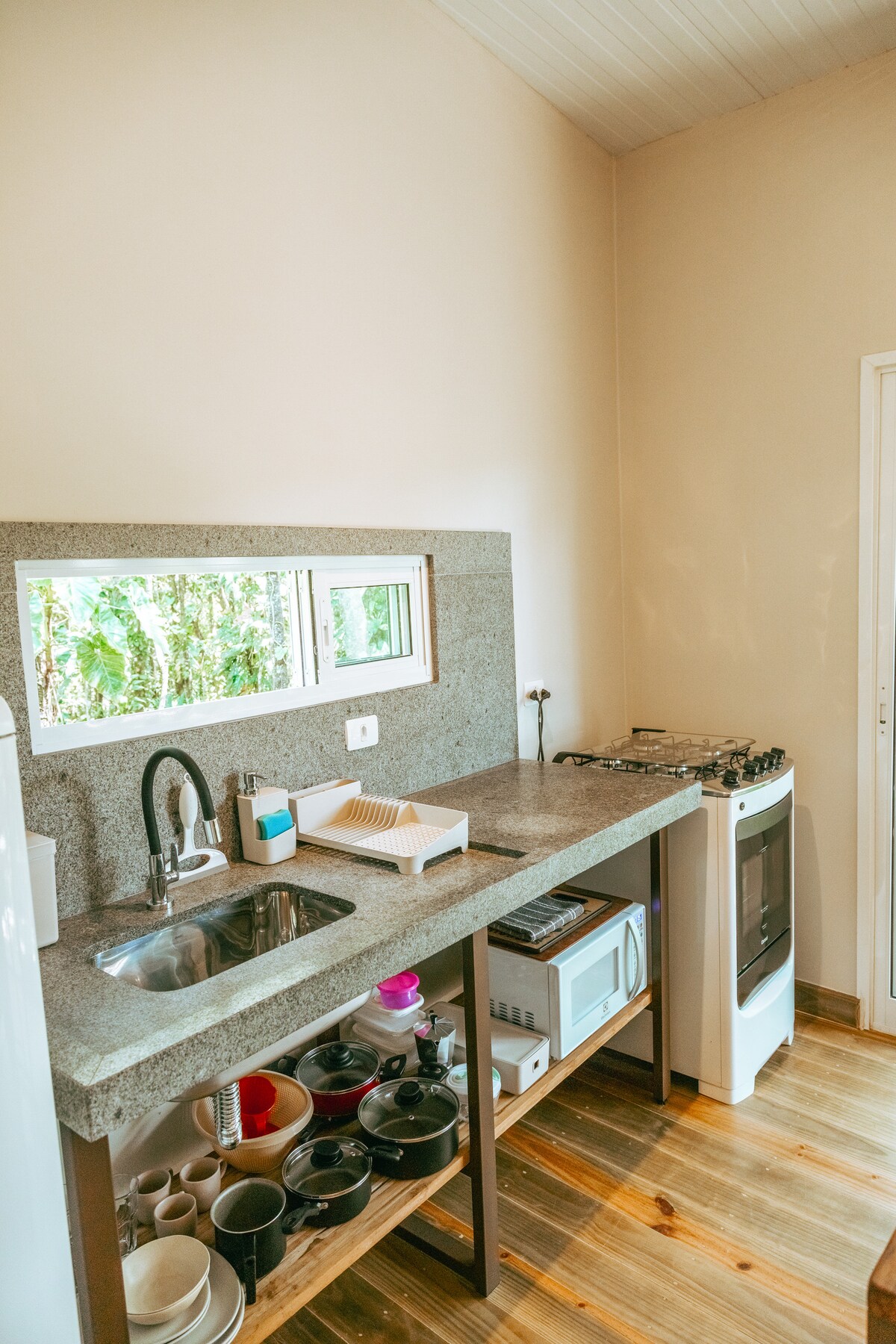 Un bungalou construit în artă în fiecare detaliu... cadă deschisă pentru pădure cu un tavan de sticlă simte senzația de a fi cufundat în natură, cu o fațadă centenară Figueira și multe păsări...intimă și primitoare în legătură cu natura în contact cu această zonă de rezervație a Pădurii Atlanticului. Celălalt duș fierbinte este situat pe terasa deschisă pentru pădure și este delicios ziua sau noaptea, cu cerul stelelor și lumina lunii.