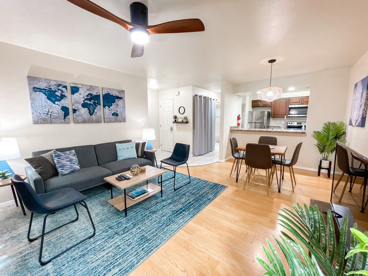 Vizavi de plaja Kalepolepo, acest apartament de 621 mp este amplasat în grădinile tropicale Zen din Kihei Resort și are un lanai spațios. Unitatea cu un dormitor a fost complet renovată și are toate facilitățile, inclusiv un pat matrimonial în dormitor și un dormitor futon în living, bucătărie complet utilată, WiFi, Samsung Smart TV, intrare fără cheie, parcare desemnată, echipamente de plajă (scaune, prosoape, jucării, echipament de snorkel) Piscină și cadă cu hidromasaj. Te rugăm să întrebi pentru tarife speciale.