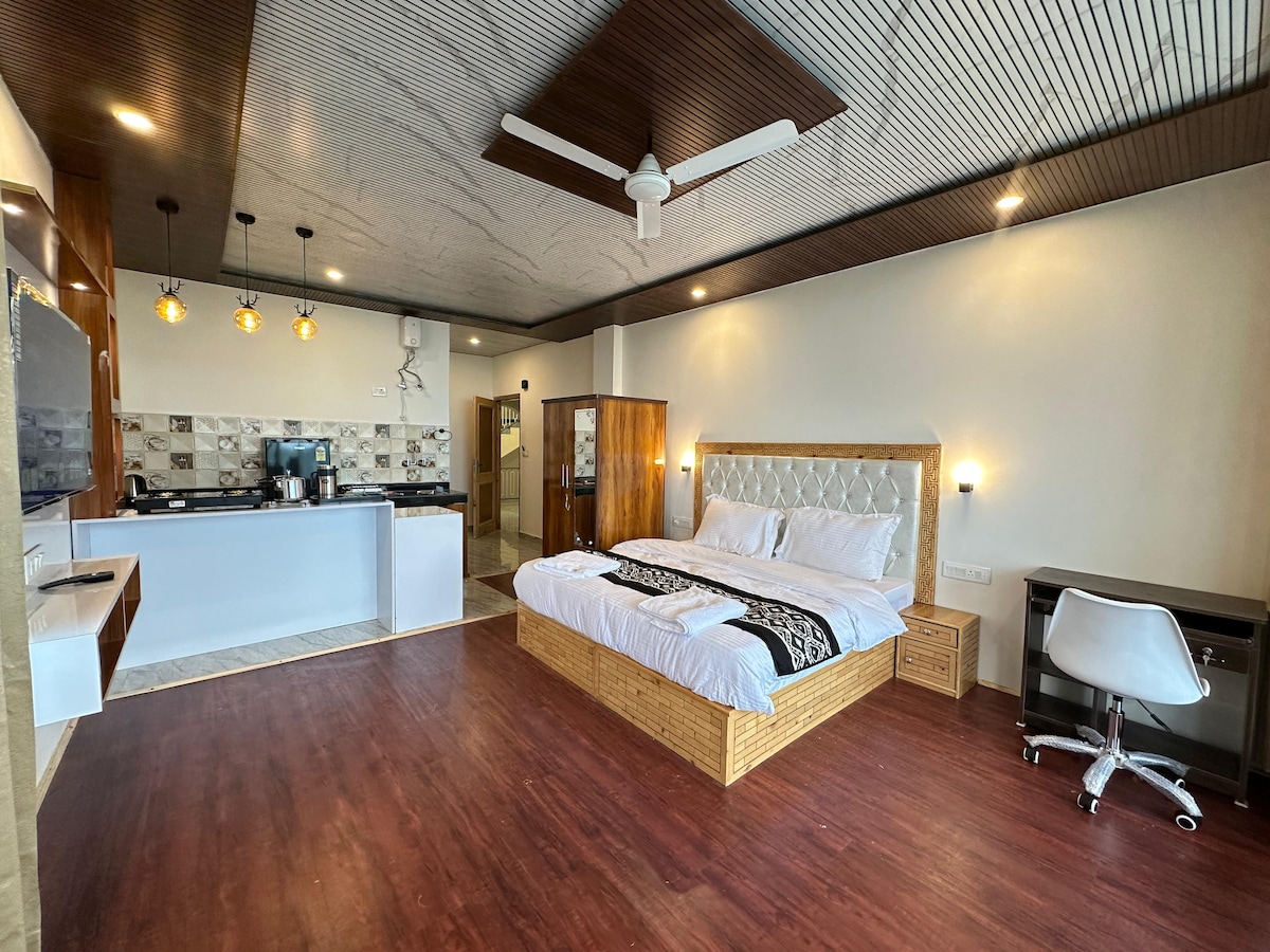 O cameră dublă de lux dedicată, nou construită, care se află în vârful muntelui din Manali. Este un loc privat în care doar 2 - 3 case sunt în apropiere, acest loc nu mai mult de atât. Locul ăsta e incredibil de fermecător. Din camera ta, poți vedea întreaga vale și ghețarul încărcat în Himalaya din Kullu - valea Manali. Această nouă cameră cu pat dublu are chicinetă atașată, baie igienică, masă de studiu, Wi-Fi și toate facilitățile de bază.