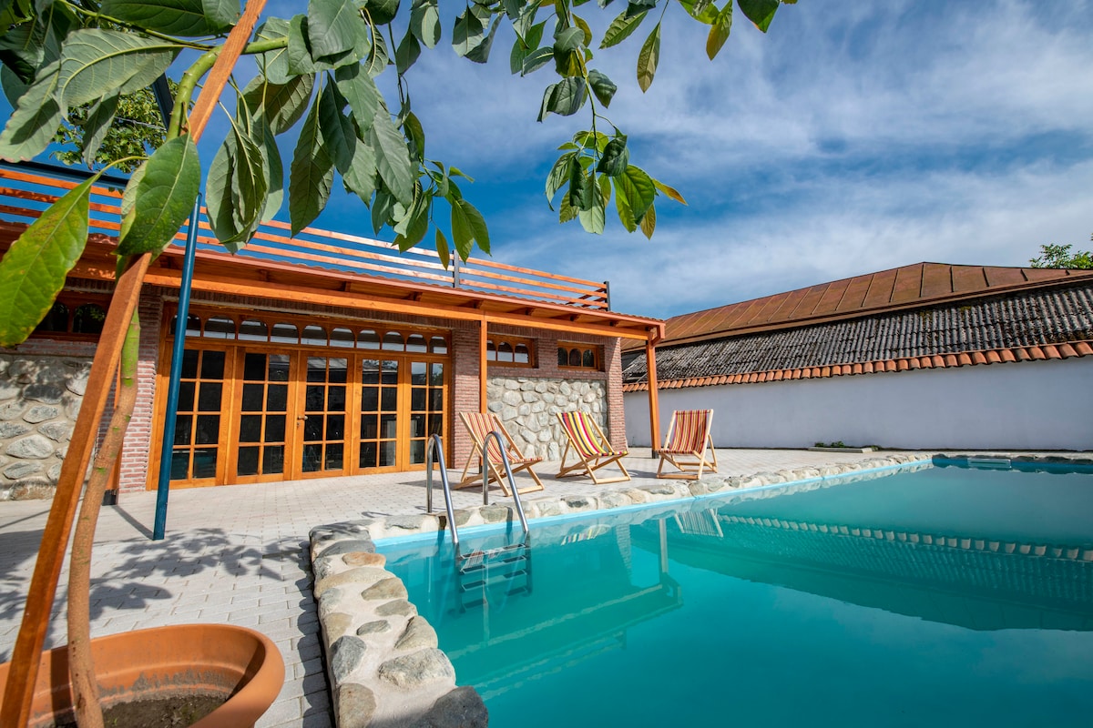The villa (old Georgian ethnic house) surrounded by the spurs of the Caucasus Mountains, located next to the Lagodekhi Reserve. Swimming pool. Indoor space with fireplace. Every space has its own bathroom. Terrace with a view of the Caucasus Mountains and a beautiful garden