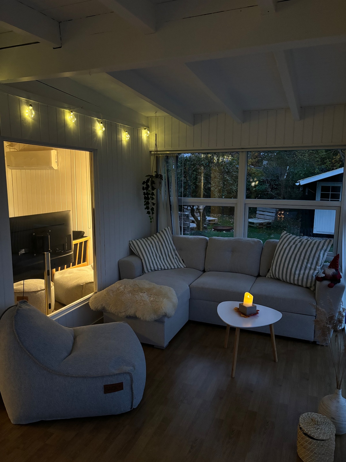 Relaxează-te în acest spațiu unic și liniștit. Situat pe un teren natural frumos, împrejmuit, cu multe păsări, veverițe etc. Casă de vacanță minunată, luminoasă, de 48 mp. 2 camere, o cameră are 11/2 paturi duble, cealaltă cameră are 2 paturi de o persoană. Baie frumoasă cu încălzire prin pardoseală. Bucătărie frumoasă, cu multe echipamente. Living frumos cu TV, șemineu, internet etc. Situat într-o zonă naturală frumoasă și foarte liniștită. Terasă frumoasă din lemn cu mobilier bun. Inclusiv: lenjerie de pat, prosoape, electricitate și apă.