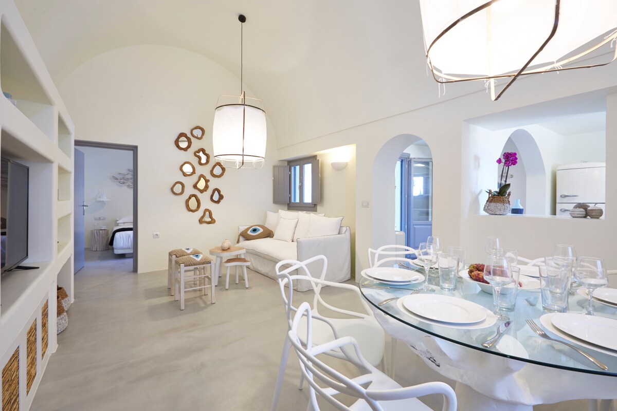 Perfect for honeymoons, anniversaries, or a romantic escape. Demeter Cave House is Santorini’s award-winning couples’ hideaway where Cycladic tradition meets calm, contemporary design. Set in Pyrgos, a lively village with a great local vibe, you’re moments from sunset bars and tavernas without the intensity of Fira or Oia - yet still tucked away in your own private cave house, with a jacuzzi and huge terrace. Authentic. Private. Perfectly placed.