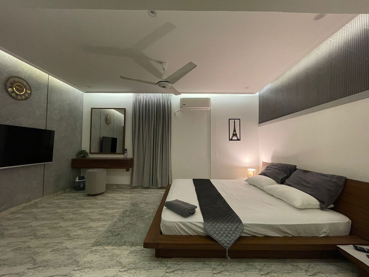 BINE AI VENIT la A Luxury Residence, un bungalou elegant nou construit, situat într-un cartier liniștit și prestigios, în locația excelentă a DHA Karachi — la doar 30 de minute de Aeroportul Internațional Jinnah și la doar 10 minute de Dolmen Mall Clifton și Sea View Beach. Acest bungalou cu două etaje oferă cazare confortabilă și elegantă pentru până la 8 oaspeți cu 4 dormitoare private, fiecare dotat cu facilități moderne pentru a asigura un sejur luxos și memorabil. Acceptăm numai rezervări de la familii.