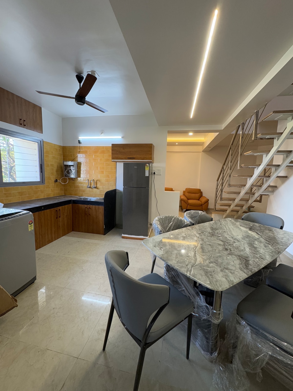 Apartament modern mobilat la ultimul etaj, cu 1 dormitor și bucătărie, în Balajinagar, Sangli, lângă Kupwad și Miraj MIDC. Living luminos cu fereastră mare din sticlă și vedere deschisă, Smart TV de 55”, WiFi de mare viteză și canapea extensibilă. Bucătărie modulară complet utilată, mașină de spălat rufe, dormitor cu birou, apă caldă și parcare. Ideal pentru șederi corporative, cupluri și familii mici. Check-in independent disponibil.
