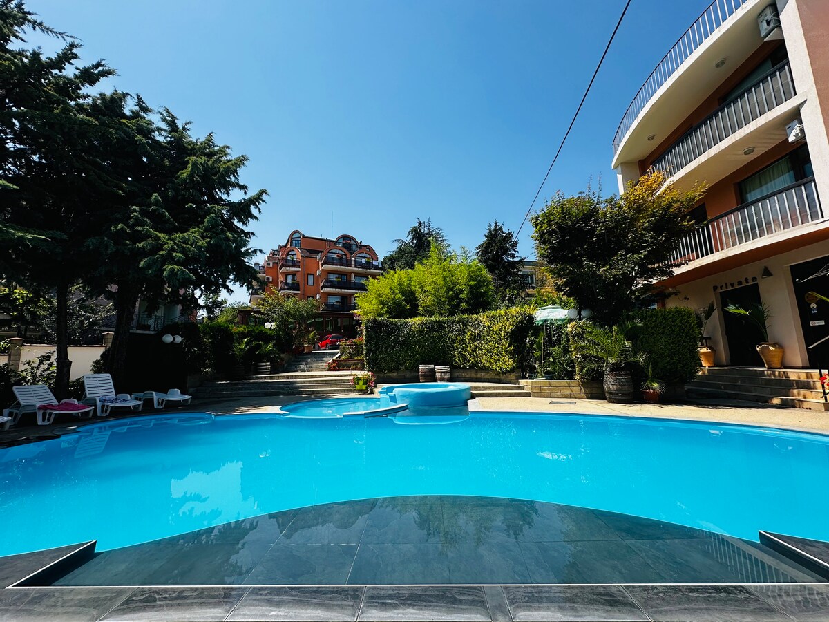 „Home of Delight” Pentru confortul dvs., combinat cu liniște, exotism și confortul farmecului de acasă, cu o gură de mare și plajă, prospețime naturală dimineața cu o ceașcă de cafea aromată și dinamica seri frumoase de vară împărtășite cu cei dragi și prieteni!🌴🌞🌺 Bine ai venit la Varna - capitala noastră maritimă, Chaika Resort, Kabakum, Palatul Argish - un complex exotic închis, cu securitate non-stop și un loc de parcare inclus! Kabakum Beach 7-10 min. de mers pe jos, 600 m. Există restaurante, magazine alimentare, piscine în apropiere!