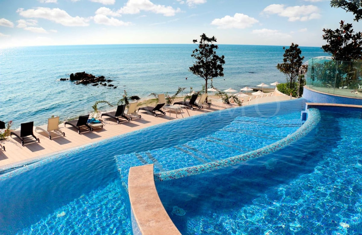 Sea Sunrise & Modern Luxury – Your Coastal Escape Scufundă-te într-o oază modernă de pe litoral, unde fiecare zi începe cu un răsărit de soare peste mare și se termină cu sunetul calmant al valurilor. Situat la câțiva pași de plaja Kabakum, acest apartament îmbină confortul unei atmosfere primitoare, design elegant și priveliști uimitoare ale mării pentru a crea escapada perfectă. - 300 m până la plaja Kabakum, 680 m până la Resort Sunny Day - 26 de minute până la Aeroportul Internațional Varna