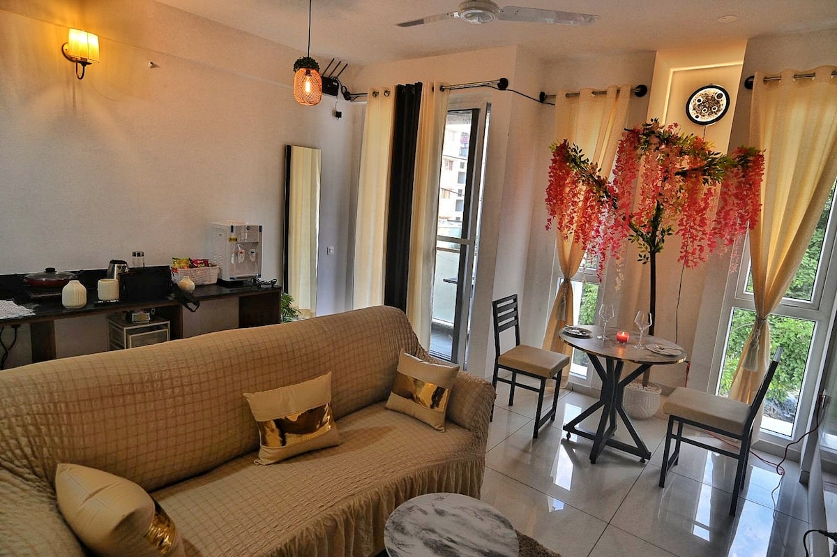 Ne-ar plăcea să te găzduim în 1 BHK (Earthy Homestay) care îmbină stilul cu o atmosferă pământească, liniștită și panorame imbatabile. - Oază cu balcon: vedere la pădure + apusuri de soare cinematografice la 200 m - Prime Locale: 2 minute până la NIFT și 3 minute până la cafenelele, buticurile și mâncarea stradalădin 27 Main - Interioare liniștite: pat matrimonial, iluminat ambiental și plante vii luxuriante - Work & Play: Wi-Fi de mare viteză, TV mare și aer curat Experimentează stilul, liniștea și apusurile de soare spectaculoase, toate într-un singur refugiu confortabil! - Etajul 5 (fără lift)