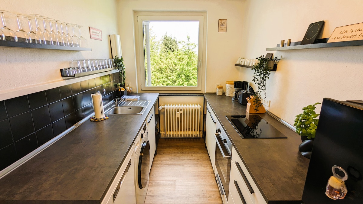 Apartamentul (60m²) este situat la aproximativ 13 km de centrul orașului Kassel. Există un acces foarte bun la mijloacele de transport în comun. Tramvaiul regional merge direct la Innestadt din Kassel în 20 de minute. Expresul regional merge direct la gara Wilhelmshöhe în 11 minute. Gara se află la 600 m. Apartamentul este situat la subsolul casei și are un dormitor, un living cu canapea extensibilă, precum și bucătărie și baie. Există, de asemenea, o terasă privată.