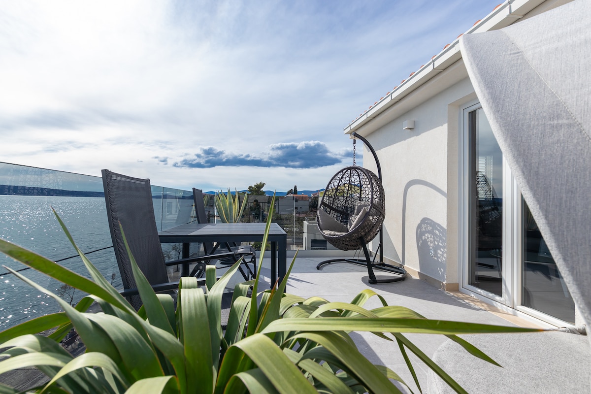 Faţa mării, ultimul etaj cu o privelişte uimitoare. Situat între Split, capitala coastei Dalmației, pe de o parte, și o stațiune frumoasă din Trogir, pe de altă parte. Acesta se mândreşte cu o locaţie liniştită, dar convenabilă, cu o scurtă călătorie cu autobuzul până la Split şi Trogir.