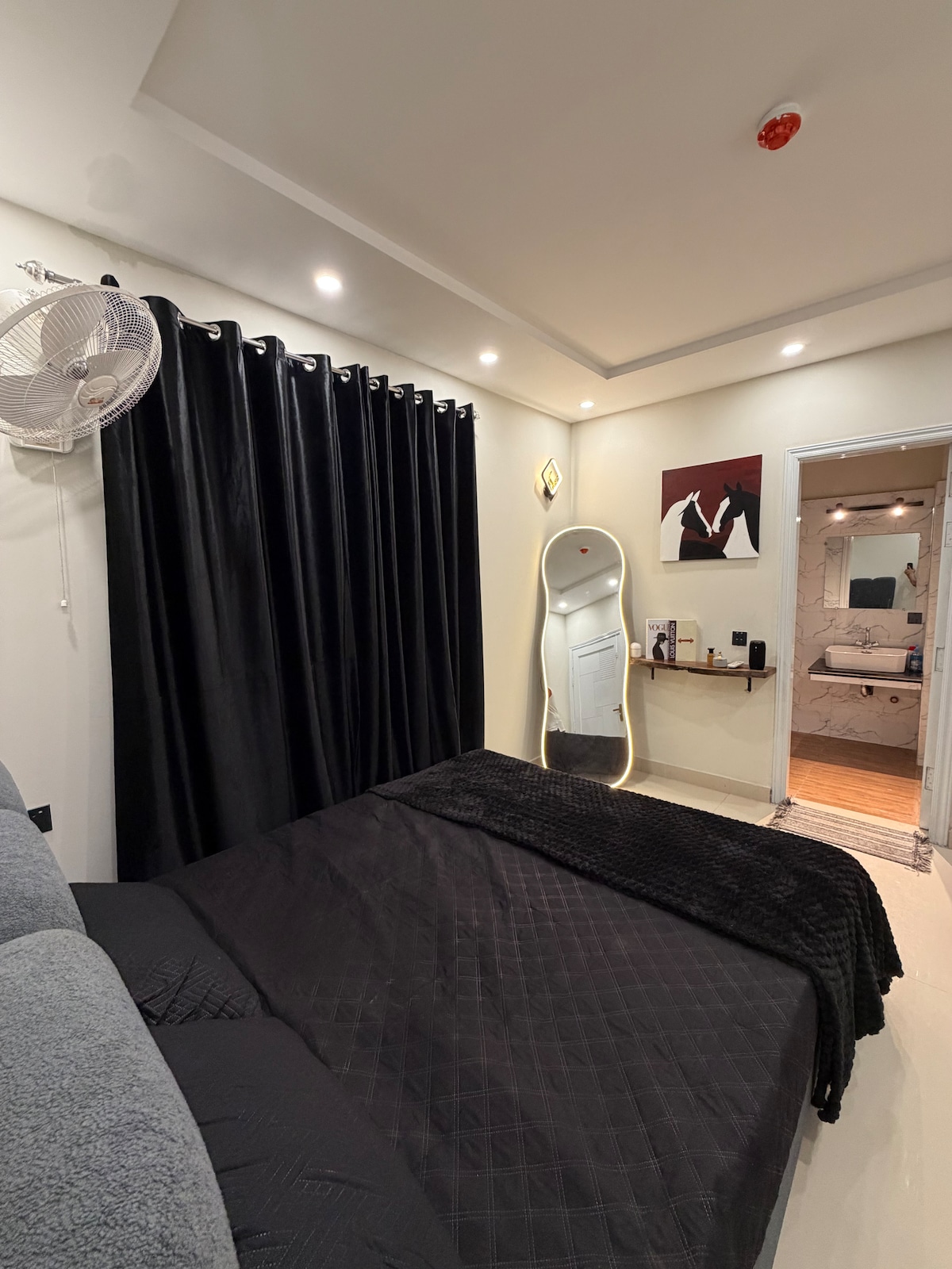 Bine ai venit la Stay Luxs 1 Apartament de lux în stil american, cu 1 dormitor și 1 baie, cu vedere uimitoare zi și noapte 🌟 — ideal pentru cupluri, prieteni, femei care călătoresc singure și familii. Situat în inima orașului Bahria Lahore, oferind o atmosferă liniștită, cu toate elementele esențiale la câțiva pași. Poziție privată sigură și securizată - Check-in independent cu cod PIN sau card - Încuietoare dublă în interior pentru liniștea ta sufletească - Securitate non-stop - Pat matrimonial „King” cu saltea cu arcuri foarte moale - Încălzire și răcire AC - Numai bucătărie uscată