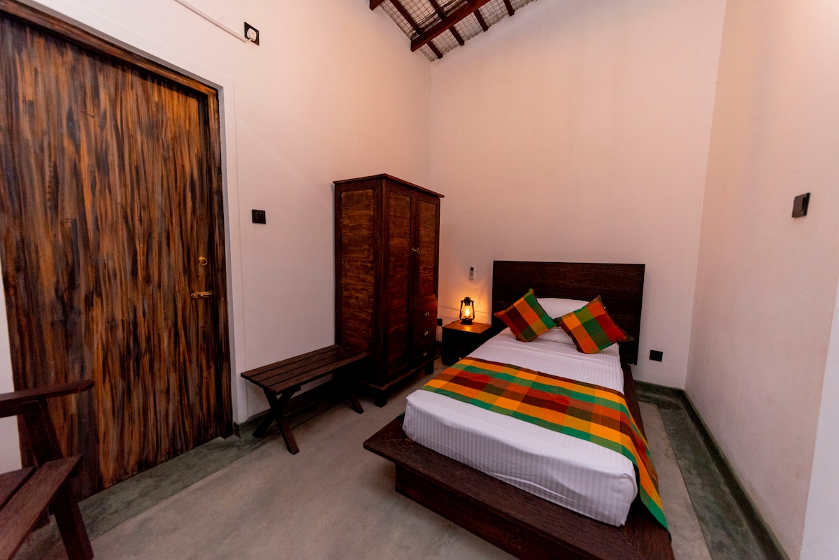 Casă rustică cu 3 unități (6 camere, 6 toalete atașate) pe 1,5 acri de cocos și palmier. Numărul de unități deschise depinde de dimensiunea grupului – te rugăm să discuți despre aranjarea camerei dacă ai preferințe speciale. Vedere panoramică de 360° la marginea plajelor Kirinda și Magama. Lângă parcurile Yala și Bundala. Cazare simplă, fără lux, cu mâncare excelentă, personal prietenos, asistență non-stop, securitate și TV prin satelit.