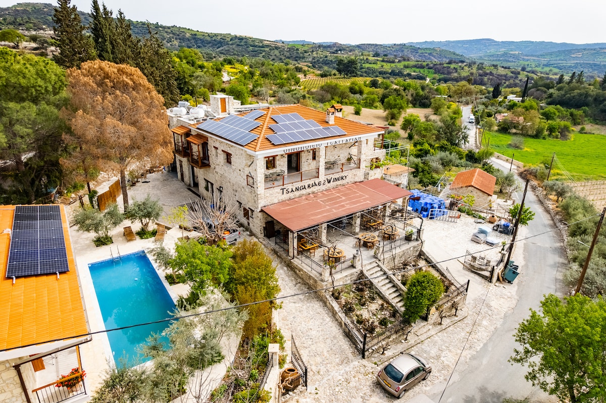 - Situat deasupra cramei noastre de familie din satul Lemona. - Degustare gratuită de vinuri și platou cu brânzeturi/carne pentru oaspeții noștri. - Terasă privată spațioasă (40 mp) cu zonă de luat masa și jacuzzi privat încălzit cu vedere magnifică la vale și la podgoriile noastre - Bucură-te de vin în cele trei curți spațioase, deschise până la 17:00 și pline de viață. - Piscină comună mai - octombrie. - Amplasare perfectă pentru cei care doresc să exploreze regiunea Paphos: 10 minute de mers cu mașina de Minthis Hills Golf Resort