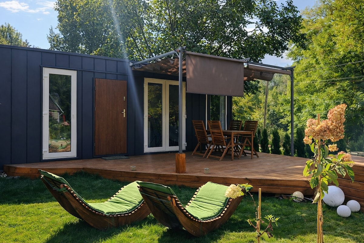 Bungalow confortabil (35mkw) cu terasă privată acoperită cu încălzire (15mkw). O bucătărie complet utilată, un pat matrimonial cu bandă din spumă cu memorie și duș cu efect de ploaie supradimensionat XXL. Cadă cu hidromasaj privată în aer liber. Deschis iarna la o temperatură de peste -3 grade Celsius. O clădire înconjurată de o grădină semicirculară privată care trece fără probleme în pajiștile de pe malul râului. În zona comună a hamacelor de grădină, grătar cu cărbune, groapă de foc, mobilier de grădină.
