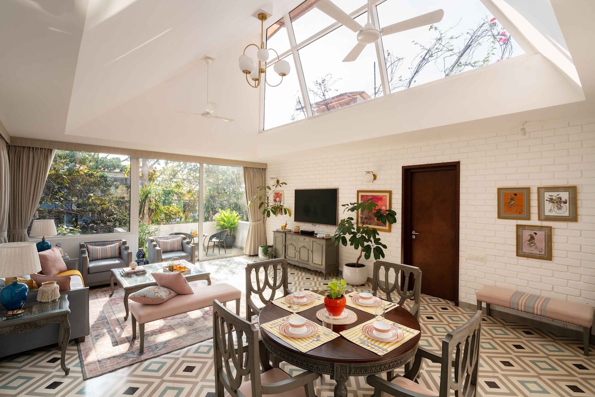 Un 1 bhk curat, cu o grădină privată și o piscină, situat într-un complex pitoresc amenajat considerat a fi una dintre cele mai elegante zone din Goa de Nord, lângă plaja Candolim. Vei fi aproape de locurile care se întâmplă din nordul Goa atunci când stai în acest loc situat central. O echipă de curățenie completă îți face șederea confortabilă. Unele locuri populare din apropiere sunt Lazy Goose, Yazu, Burger Factory, Reis Magos Fort și Church.