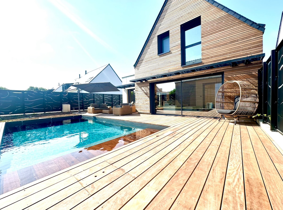 Casă semi-detașată de 90 m2 care nu este trecută cu vederea, cu intrare independentă, terasă privată, acces la grădină împădurită de 1500 m2 (cu iaz). Două dormitoare cu paturi duble și o canapea extensibilă în living. Livinguri cu vedere la grădină. Zonă de relaxare cu șezlonguri în grădină. Piscină interioară încălzită la 28°, ideală pentru un moment de relaxare ( 5x5m, 1m50 de prof.), accesibilă prin GRĂDINĂ. Casă înconjurată de trasee de mers pe jos și 1,5 km până la plaja Kerilhio.
