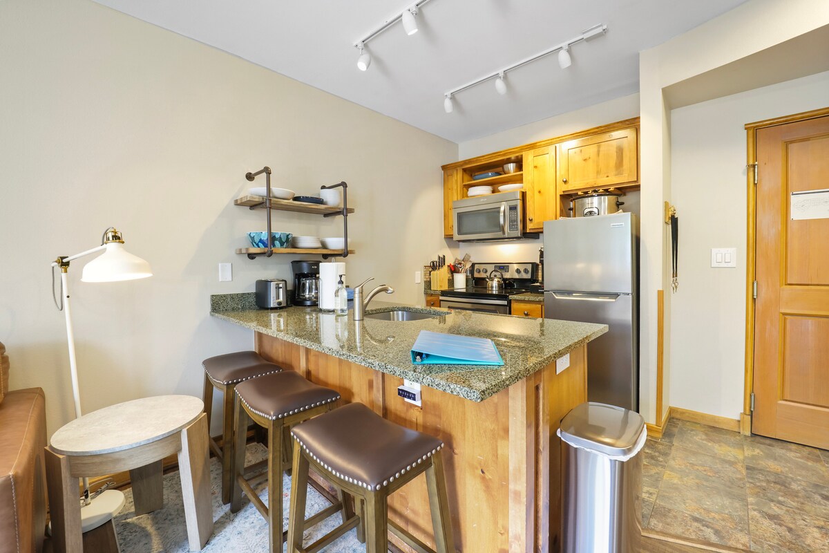 Bine ai venit în apartamentul nostru luminos și luminos cu 1 dormitor din inima satului River Run (Keystone Mountain)! Evită transferurile la lifturi, deoarece acest apartament se află la 3 minute de mers pe jos de gondolă! Acest apartament poate găzdui patru persoane și dispune de un dormitor privat cu pat matrimonial, precum și de o unitate actualizată, cu blaturi din granit. Bucură-te de băutura preferată în timp ce te bucuri de soare și de priveliști spectaculoase ale pârtiei, fie în interior, încălzit lângă foc, fie afară, pe balconul tău privat.