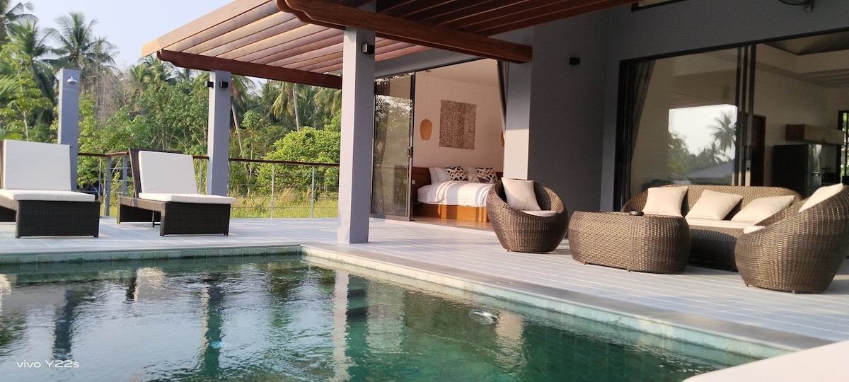 Vilă elegantă cu piscină privată în Koh Phangan Experimentează eleganța tropicală în această vilă nou-nouță cu 2 dormitoare, concepută pentru intimitate, confort și relaxare. Amplasat într-o livadă de nucă de cocos liniștită, acest refugiu modern oferă: ✨ O piscină privată cu șezlonguri 🛏️ 2 dormitoare spațioase cu paturi matrimoniale Zonă de zi 🛋️ în plan deschis, cu o canapea confortabilă și TV inteligent 🍽️ Bucătărie complet echipată, cu scaune de bar Terasă 🌿 de luat masa în exterior 🌴 Înconjurat de verdeață luxuriantă și gard de bambus