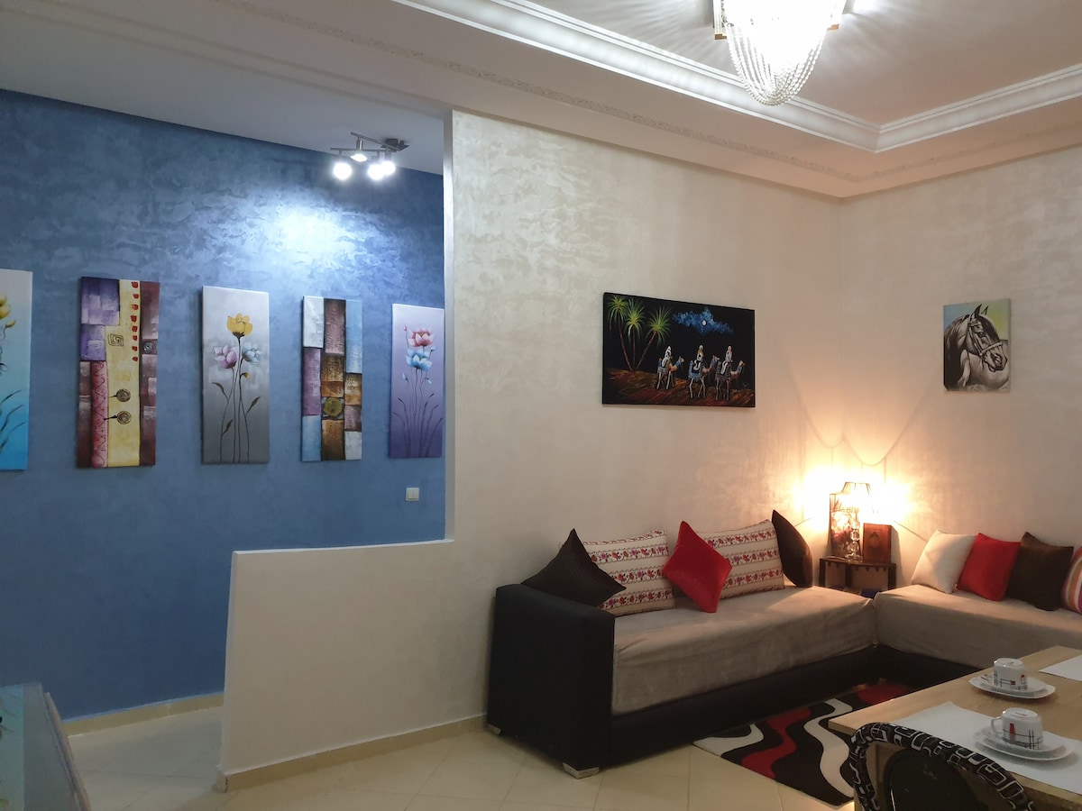 Superbe appartement calme, 10 minutes de l’océan et d’un centre aquatique , 10 minutes de la ville et des centres commerciaux , restos quelques minutes à pieds. Une très belle visite a faire , la ville de Tanger ( là où la Méditerranée et l’océan se rejoignent), à plus ou moins 1 heure en TGV pour un prix très modique Bref , un bon petit lieu pour se reposer et profiter du soleil