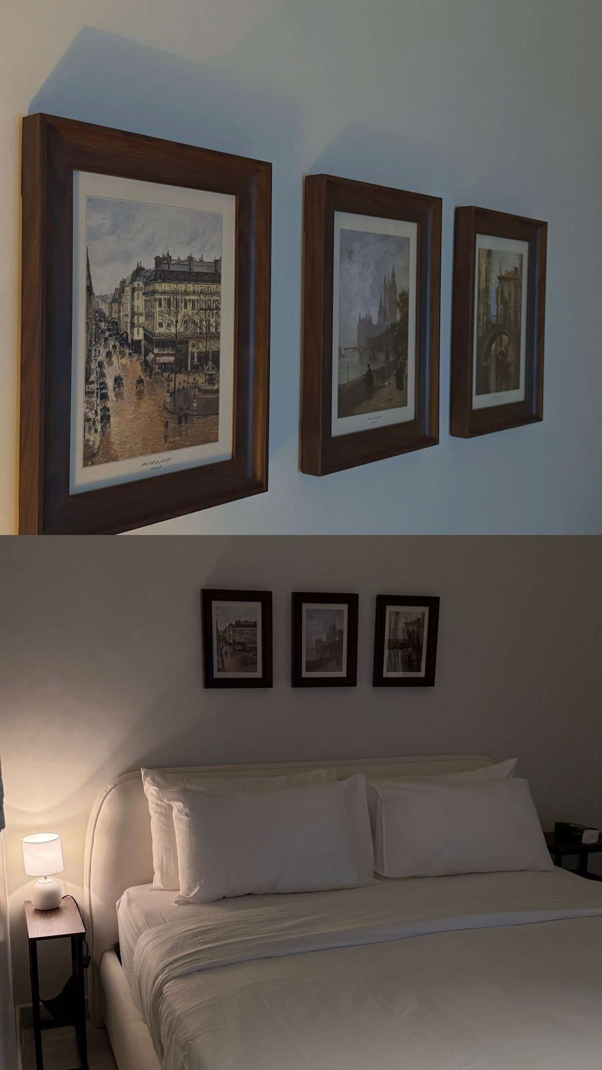 Studio de lux cu vedere directă la Podul Bahrain și la mare, situat strategic lângă Shubaili Mall. Designul este elegant și liniștit, cu culori calde și iluminat echilibrat, care oferă o senzație de hotel elegant. Zona de dormit este dotată cu un pat luxos și decor modern, cu un separator din lemn care oferă intimitate și o notă de design înaltă. Sesiunea este confortabilă cu o canapea din piele și accente de blană care adaugă căldură locului, pe lângă o zonă de lucru/prelucrare ordonată cu o oglindă LED și plante de interior care dau un spirit și un caracter sofisticat. Locuința este perfectă pentru cei care doresc confort, intimitate și gusturi înalte pentru o familie mică și călători care caută o experiență de cazare diferită și aproape de toate serviciile
