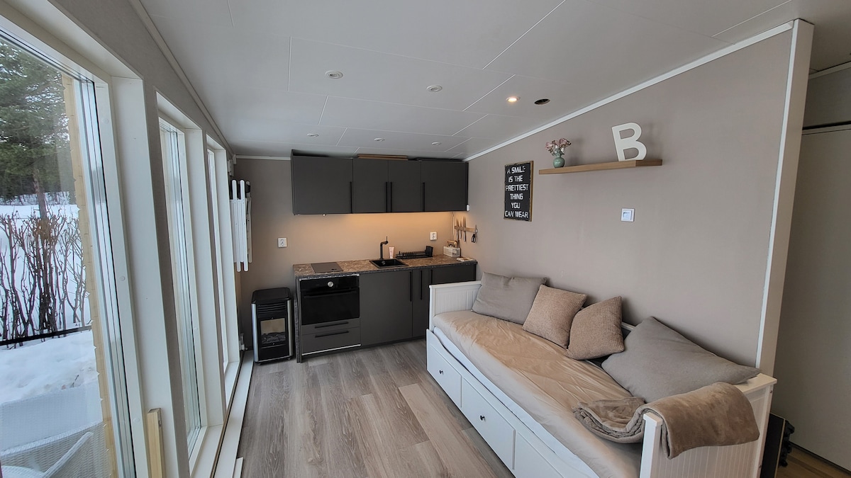 Apartamentul, la aproximativ 24 mp, este situat la ferma privată din zona rezidențială, Tuolluvaara. Intrare privată, bucătărie complet utilată, toaletă, TV. Tuolluvaara este situată la aproximativ 3 km de aeroportul Kiruna, la aproximativ 2 km de centrul nou Kiruna, la aproximativ 6 km de centrul vechi și la aproximativ 13 km de Ishotellet în Jukkasjärvi (aproximativ 15 minute cu mașina). Datorită mineritului, există o conversie interesantă a orașului în Kiruna, iar noul centru al orașului a fost deschis în septembrie 2022.