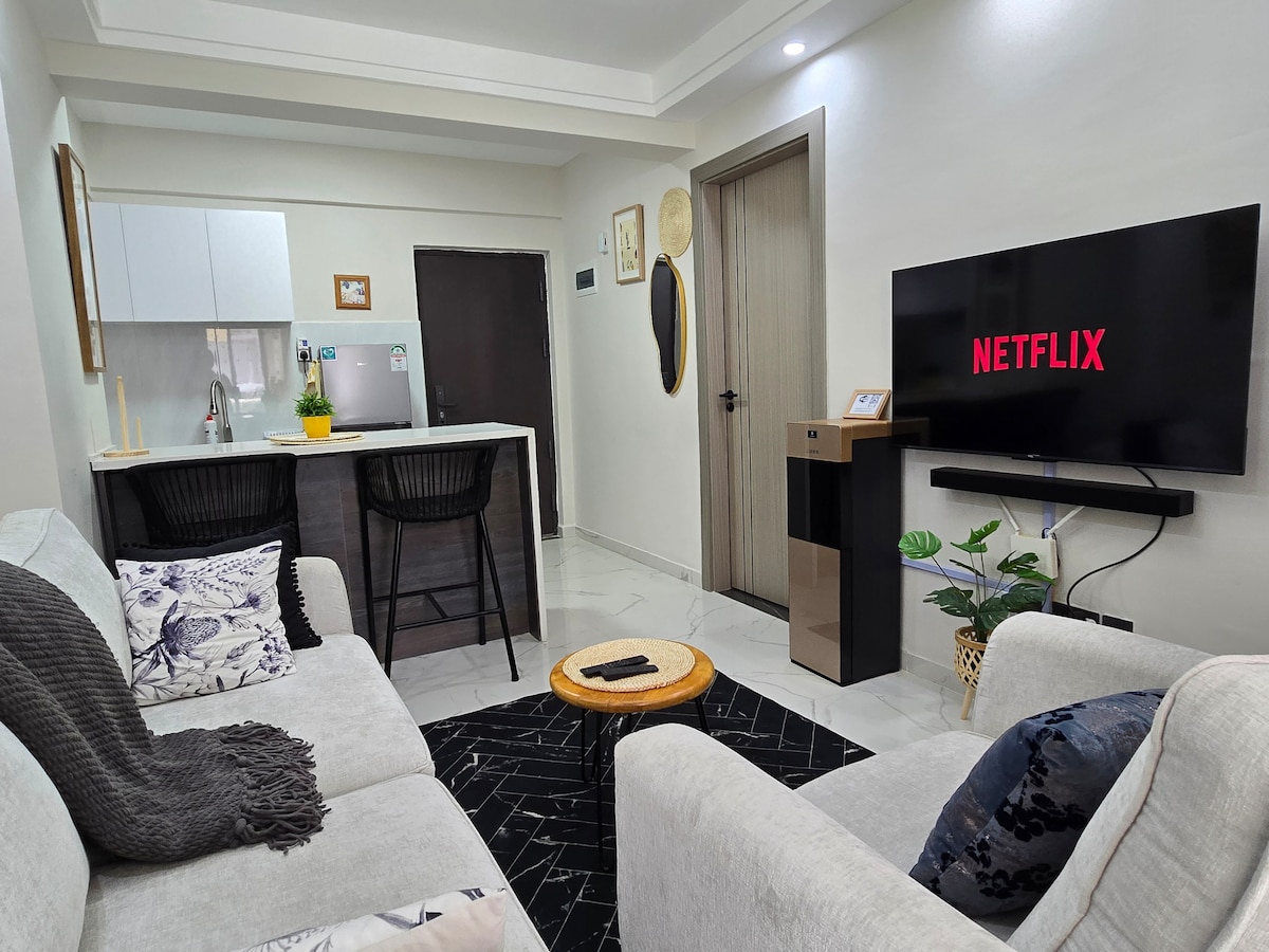 Bucură-te de un stil de viață modern în acest apartament cu 1 dormitor, cu un al doilea dormitor mic (birou transformat), ideal pentru până la 3 oaspeți (2 în comun). Mobilat pentru confort și comoditate pentru șederi de lungă durată în Nairobi. 1. Dormitorul principal are un pat matrimonial și dulapuri încorporate. 2. Al doilea dormitor are un pat de o persoană și un dulap pentru depozitare. Internet de mare viteză, Google TV de 50", mașină de spălat, chicinetă completă, zonă de luat masa, sală de sport. Generator de rezervă, parcare gratuită. Aproape de spitalele Upperhill, coptic și KNH, ambasade, CBD și un teren de golf.