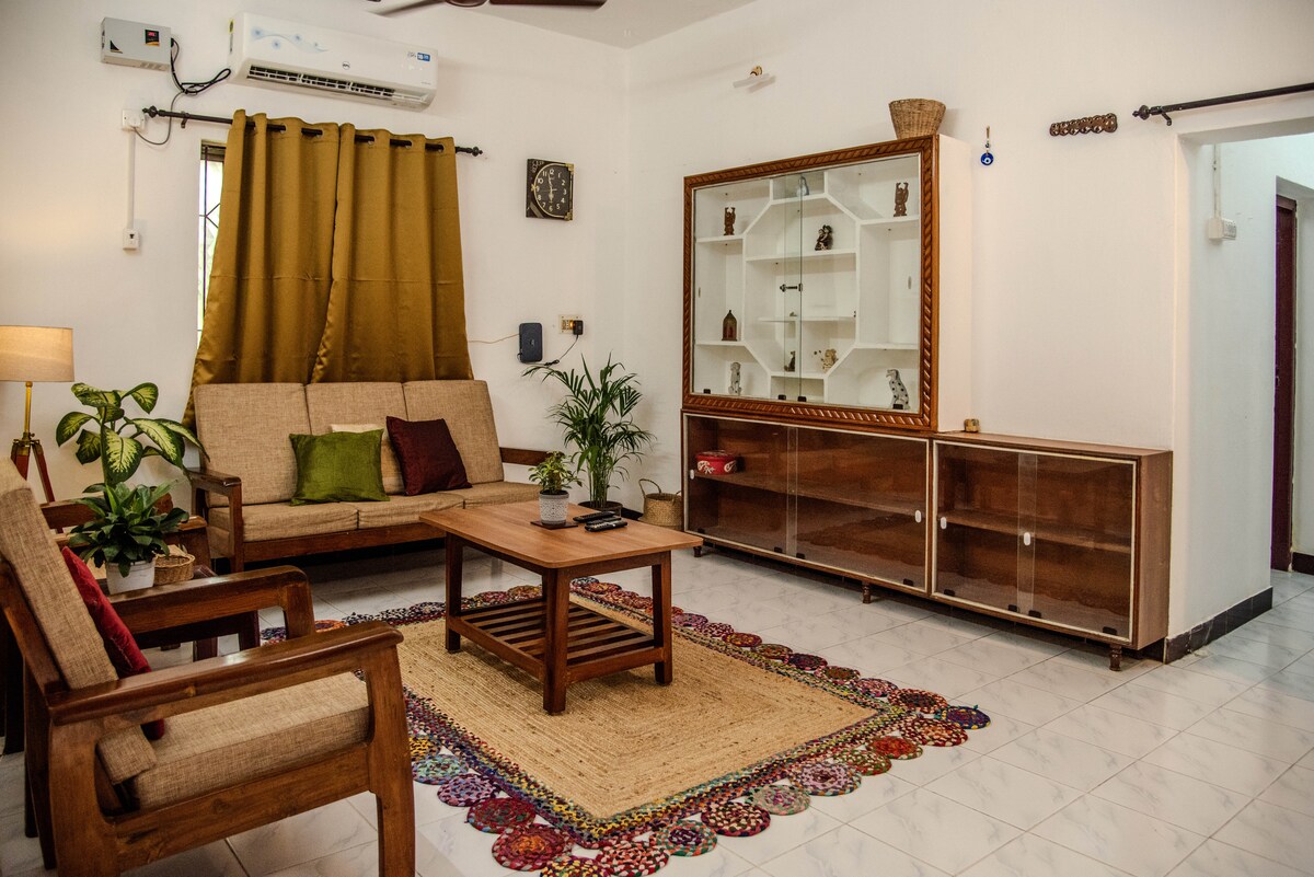 Fă un pas înapoi în timp și experimentează farmecul unei locuințe din Chennai din anii 1990 la Mama Rose. Acest paradis cu 2 dormitoare îmbină elementele tradiționale – cum ar fi o râșniță de piatră și vase de lut – cu facilități moderne, cum ar fi Wi-Fi de mare viteză, Smart TV cu abonamente OTT și o mașină de spălat cu uscător. Acest anunț include primul etaj al casei noastre, cu intrare privată și terasă pentru a te bucura de briza răcoroasă de seară. Proprietatea înconjoară verdeața luxuriantă, cu banane, guava și cremă de meri care adaugă liniște.