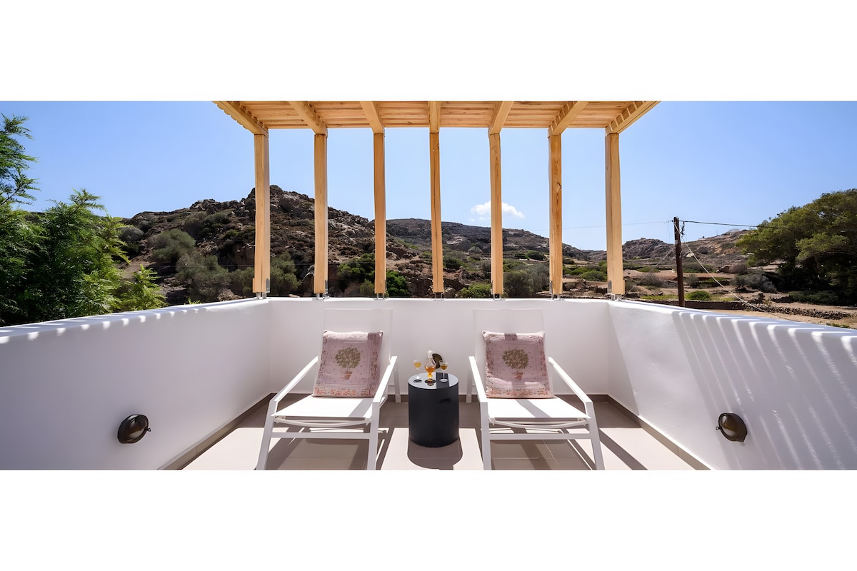 Private, high-ceilinged farmhouse apartment with bedroom and bathroom. Special kitchen corner, preparation of breakfast & cold dishes. 2 balconies (40m2 in total), with a panoramic view of the port in front and the sea of Sarakiniko behind (the lunar landscape is only 15 minutes away on foot). Distances: 4 minutes from the port and 7 from the airport by car, Plaka: 5km, Pollonia: 7km, Fyriplaka-Tsigrado in 15 minutes. Recently landscaped garden, natural environment with privacy & tranquility