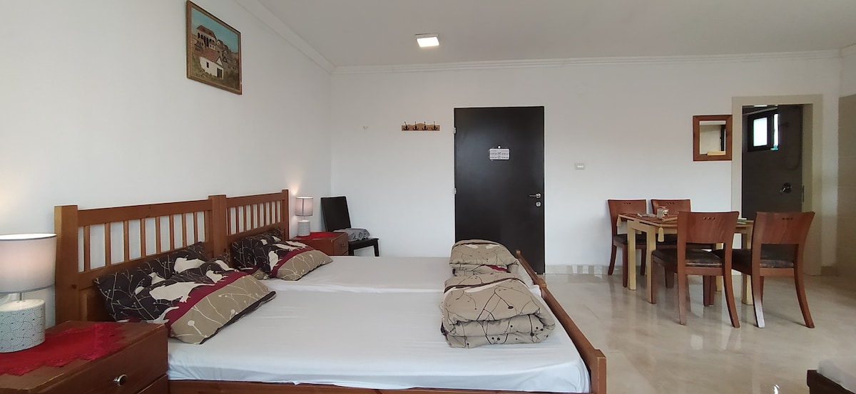 Casa noastră (80 m²) se află într-o comunitate agricolă liniștită din Golan Heights. Este o singură casă rustică, cu un spațiu protejat de apartament (mmd). Casa are două dormitoare spațioase, o bucătărie complet utilată, un living luminos și un balcon mare cu vedere. Este potrivit pentru cupluri sau o familie cu până la doi copii. Punem la dispoziție toate lenjeriile și prosoapele necesare, pentru confortul și nevoile tale. Locuim la câteva minute de mers pe jos, așa că suntem disponibili pentru a te ajuta cu orice problemă.