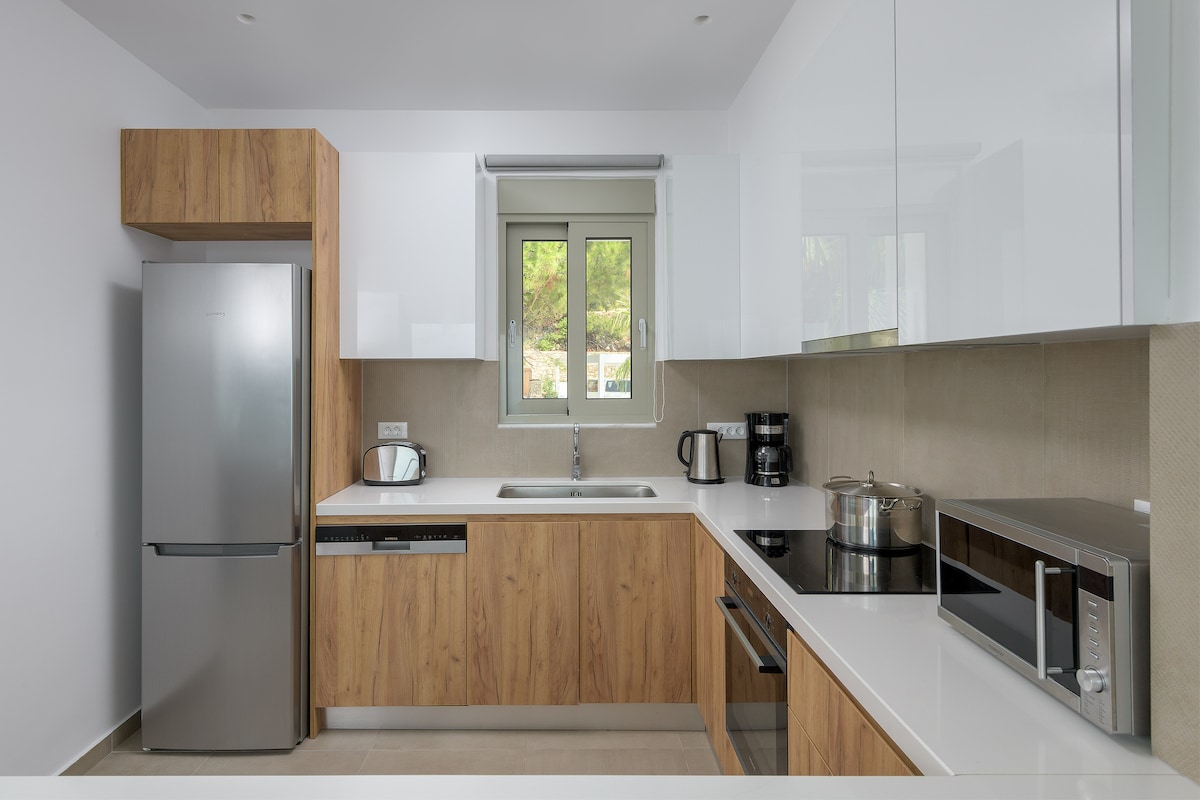 Actualizat 2020 & 21 O dragoste pentru aer liber devine imediat evidentă pe măsură ce oaspeții pășesc pe terasa principală a acestei închirieri de vacanță. O piscină privată cu o margine infinită pare să plutească deasupra mării. O pergolă mare acoperă zonele de divertisment și relaxare. Două dormitoare rafinate găzduiesc până la patru oaspeți la această vilă. Nivelul inferior include două dormitoare duble cu bai proprii. Nivelul superior este alcătuit din bucătărie complet utilată, o masă, un WC și un living.